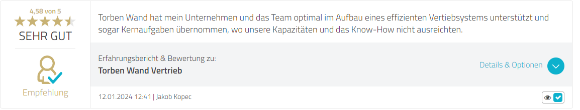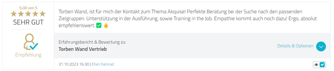 Aktuell haben sie teilweise 5 Termine am Tag. Sie suchen zusätzlich neue Vertriebler, weil sie ein System für ihren Vertrieb haben und wollen weiter wachsen.
